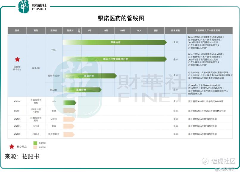 银诺医药成立于2014年,是全球第三家商业化原研人源长效胰高血糖素样肽-1(GLP-1)受体激动剂的公司。今年1月,其核心产品依苏帕格鲁肽α(商品名:怡诺轻)获国家药监局批准用于治疗2型糖尿病,并于次月实现商业化。依苏帕格鲁肽α还针对肥胖和超重及代谢功能障碍相关性脂肪性肝炎开展临床试验,其中肥胖和超重适应症已启动IIb/III期临床试验,另外还有五款处于临床前阶段的候选药物。