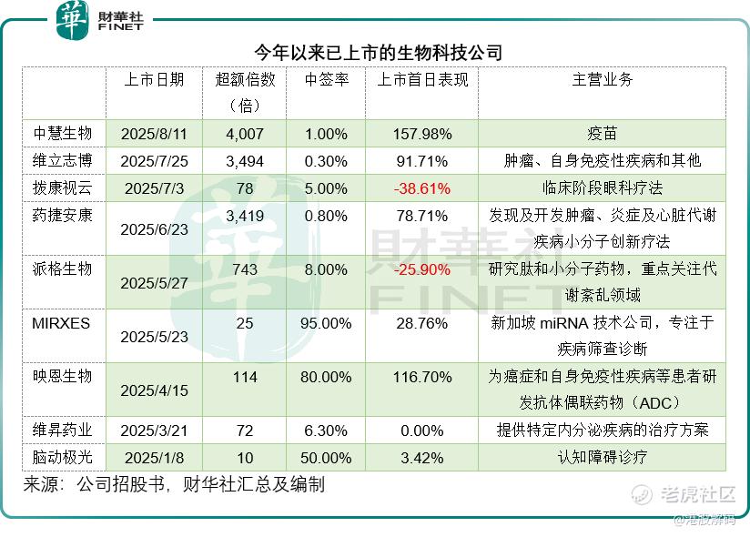 其中首日表现最好的要数疫苗股中慧生物,单日大涨157.98%,其次为研发抗体偶联药物(ADC)的映恩生物,大涨116.70%;肿瘤药股维立志博和药捷安康的首日表现也不错,分别上涨91.71%和78.71%,这两家公司招股时也获得超三千倍的散户超额认购,见下表。
