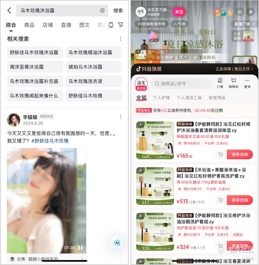 个护香氛化的趋势下,舒肤佳2024年推出新品「乌木玫瑰沐浴露」,并通过抖音等内容平台的种草被更多消费者熟知,在抖音输入「乌木玫瑰」,就会发现很多消费者都在搜「乌木玫瑰沐浴露」「乌木玫瑰舒肤佳」。