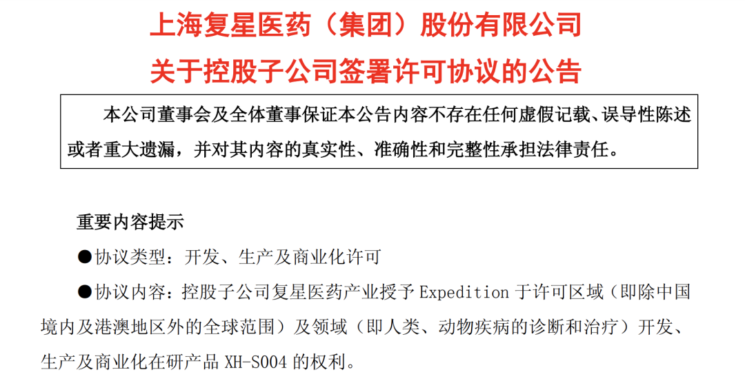 今天盘后,复星医药发布公告,其控股子公司复星医药产业授予Expedition在除中国境内及港澳地区以外地区开发、生产及商业化在研产品XH-S004的权利。