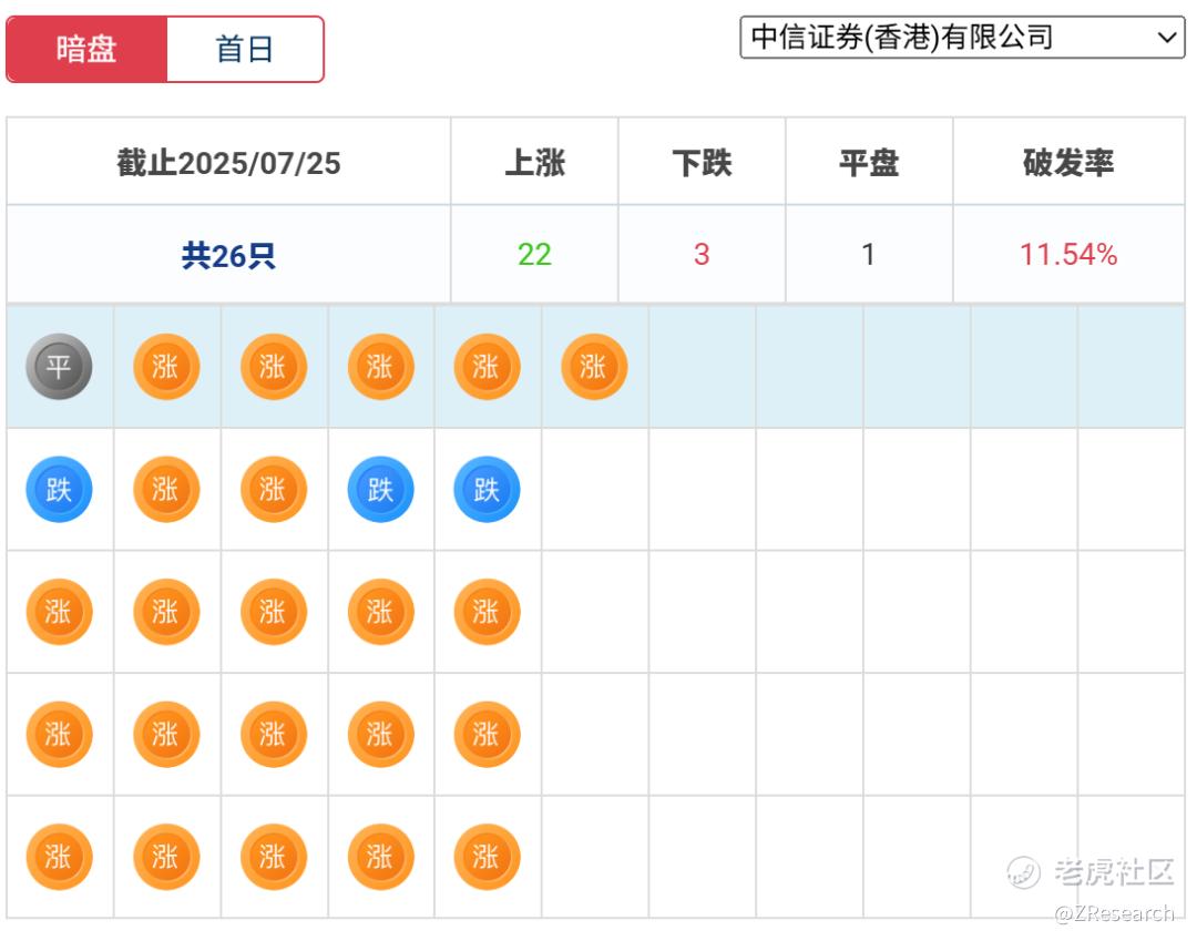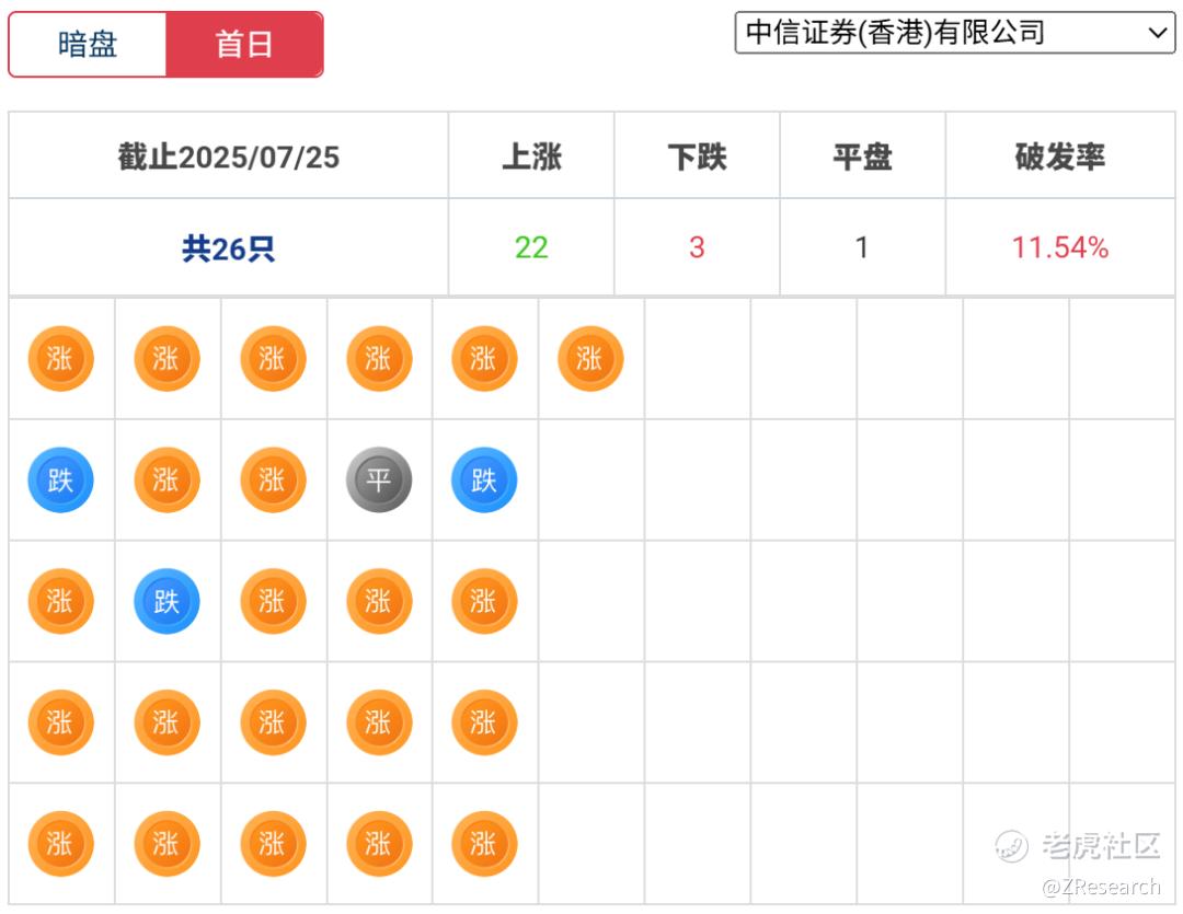 中信证券历史上作为保荐人共参与26个项目,暗盘和首日数据一致,22家公司上涨,3家公司下跌,1家公司平盘,破发率为11.54%,保荐数据处于行业前列。