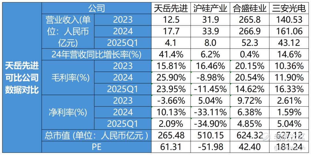 本次选取的国内行业内可比上市公司为三安光电、沪硅产业和合盛硅业。这三家公司都在A股上市,在市场地位、业务、产品、赛道布局上,三家公司都与天岳先进相近或者可对比的点,所以选取这三家公司作为可比公司。