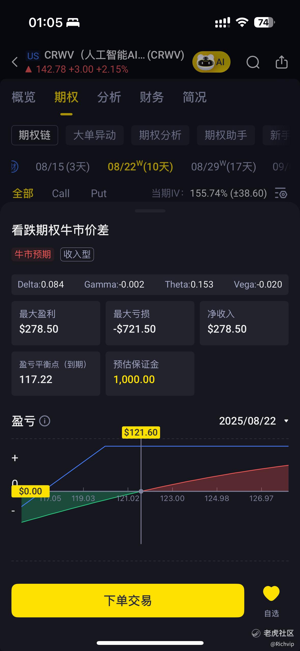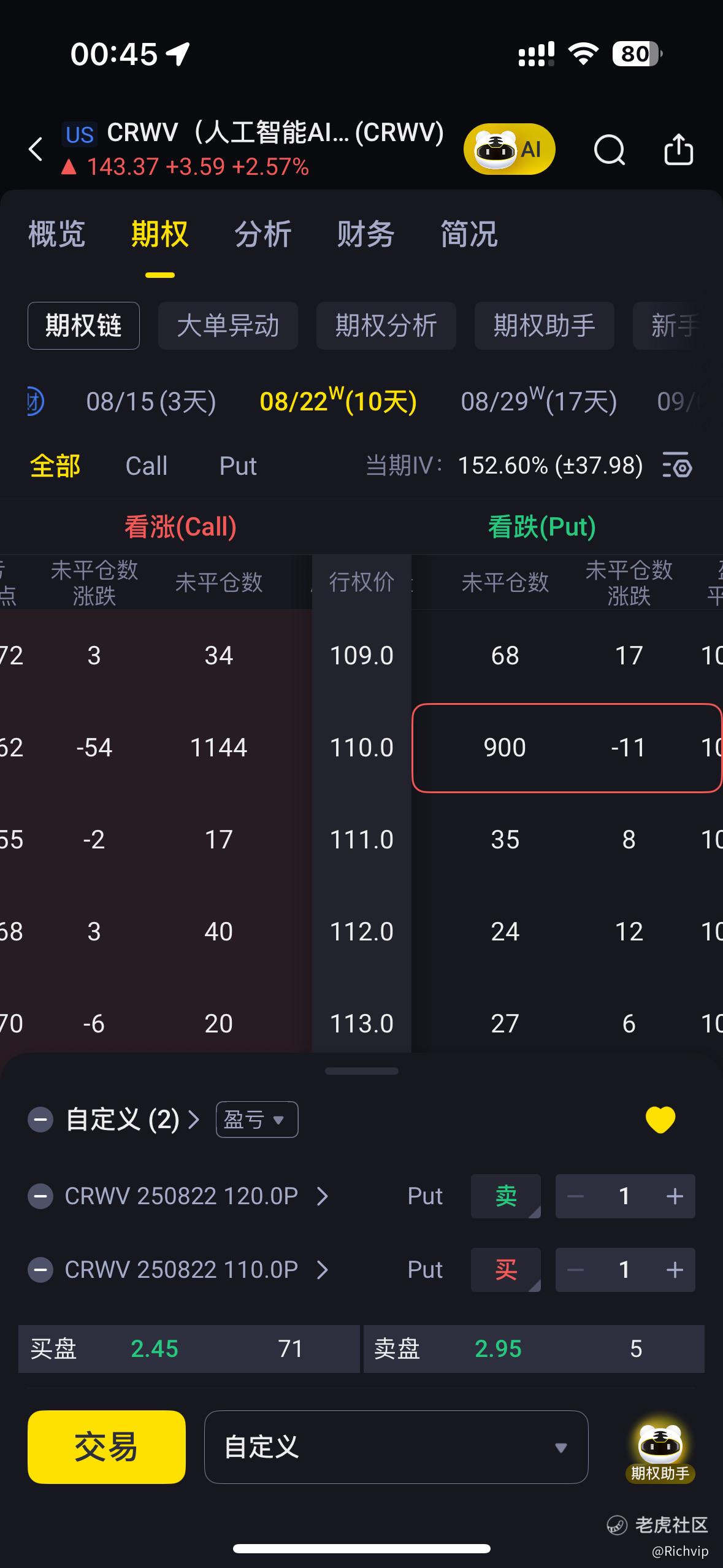 sell CRwv 20250822 120 put+buy CRwv 20250822 120put(下行保护腿)
