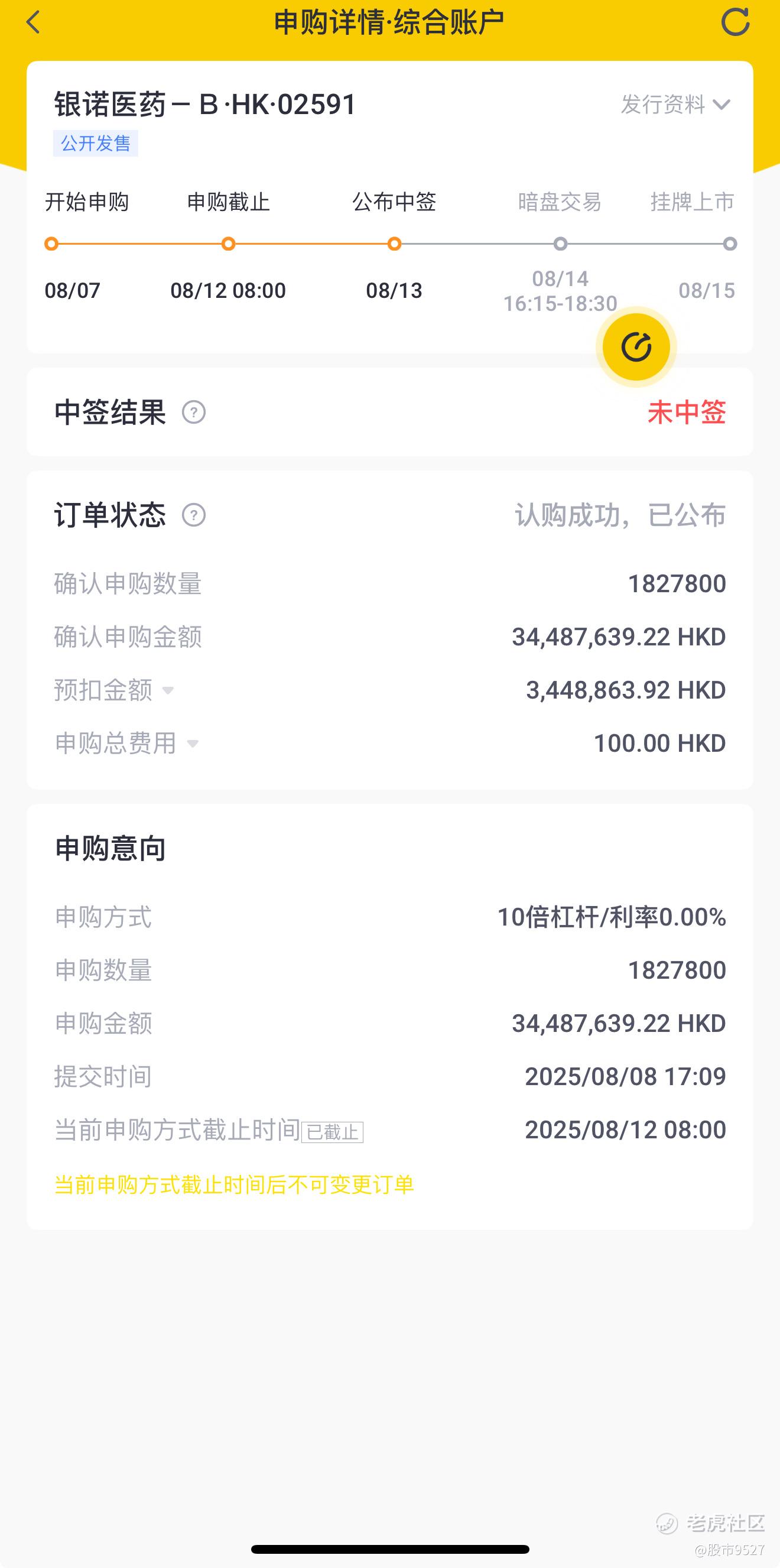 $银诺医药-B(02591)$ 顶格未中,这也是头一次了。怒亏一百港币