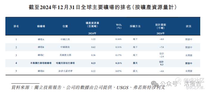巴库塔钨矿为全球第四大单一钨矿,矿产资源量23万吨,且按设计产能计排名第一。巴库塔钨矿是世界级大型露天钨矿,亦是截至2024年12月31日中国境外的最大开发中钨精矿。