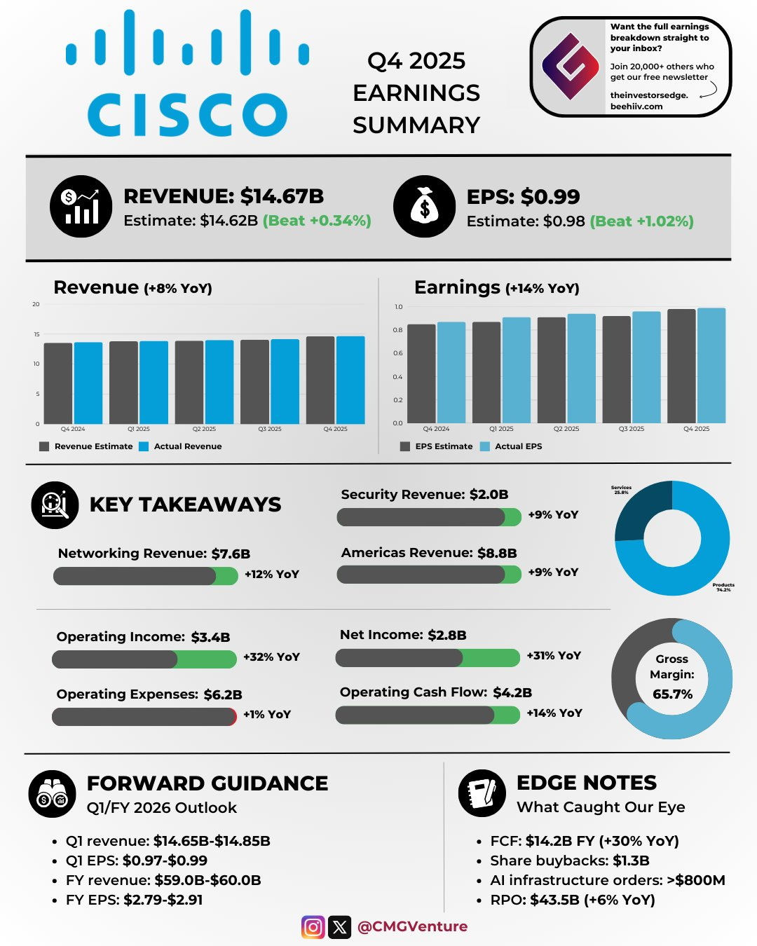 $思科(CSCO)$ 2025财年第四季度(自然年2025Q2)业绩表现优异,核心亮点在于AI基础设施订单爆发式增长和盈利能力超预期。季度营收达147亿美元(同比+8%),非GAAP EPS为0.99美元(同比+14%),均超指引上限。全年AI订单超20亿美元(达原目标的2倍),验证其在AI底层架构的领先地位。潜在瑕疵在于安全业务增速放缓(订单同比+9%)和公共部门需求疲软(订单-6%),需关注企业级AI落地节奏。