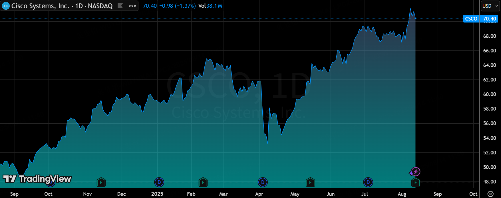 当前估值隐含较高成长预期,PEG比率约3.26,P/E约17.79,较同行如Arista(PEG 1.42)和HPE(PEG 1.02)偏高,市场可能已定价AI增长但忽略关税风险,导致盘后股价小幅下跌。相比Airbnb等平台公司(估值更注重用户增长),Cisco的估值定价较满于硬件主导的AI训练阶段,但企业AI云和网络连接机会可能被低估
