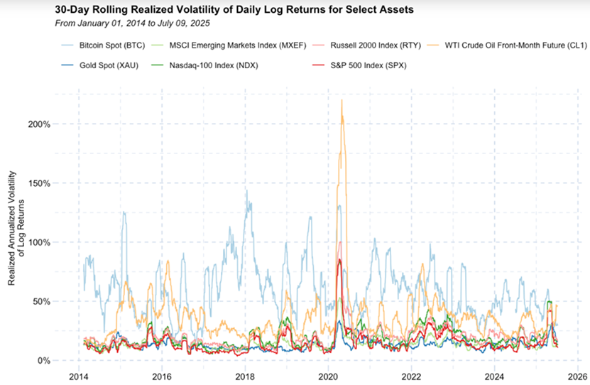 而比特币交易的疲软,主要原因是比特币的波动性越来越小。7月11日,Falconx绘制了自2014年以来BTC相对于主要资产类别的30天实际波动率,显示BTC的绝对波动率达到了历史低位,且跟主要股指和大宗商品的波动率之间的差距,已经被压缩得很小。BTC 目前的实际波动率已经低于原油,而原油传统上被认为波动性要低得多。