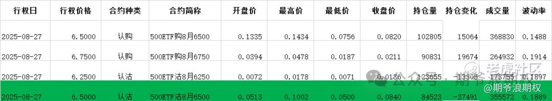 (2)中证500ETF(沪)期权:8月最大持仓范围6250-6500,今收6.514,下跌1.03%,期权8月主力合约,认购以增仓为主,主要集中在6500-7500之间,合计4.7W张;认沽以减仓为主,主要集中在5750-6500之间,合计6.1W张。今天变化超过1W张的仓位如下,绿色是减仓较多的仓位。