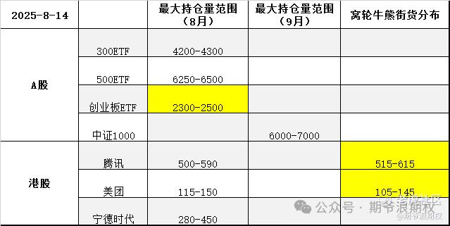 下图是今天大A的3个ETF和一个指数,以及港股的腾讯、美团和宁德时代的最大持仓量范围以及窝轮牛熊分布范围,也就是8月的资金筹码分布,黄色的表示跟上个交易日有变动。