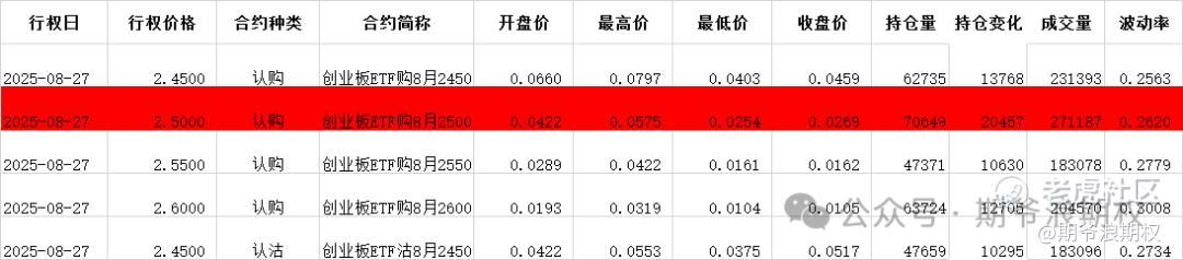 (3)创业板ETF期权:8月最大持仓范围2300-2500,今收2.446,下跌1.09%,期权8月主力合约,认购是低行权价减仓高行权价增仓,减仓较少,增仓主要集中在2450-2600,合计5.7W张;认沽则是以增仓为主,主要集中在2350-2550,合计3.3W张。值得注意的是,今天压力位上移一档。