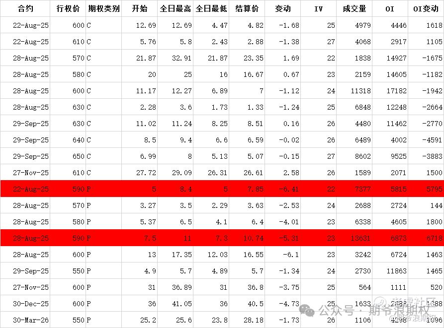 (1)腾讯:8月最大持仓范围500-590,窝轮牛熊街货分布515-615,今收590.0,上涨0.68%,期权盘路今天非常热闹,变化超过1000张的仓位如下图,红色是增仓较大的仓位,分别是8月周期权590认沽和8月590认沽。今天股王突破600大关,然后又被打下来,接下来是在590和600这个位置多空对战一段时间,然后再继续上涨。
