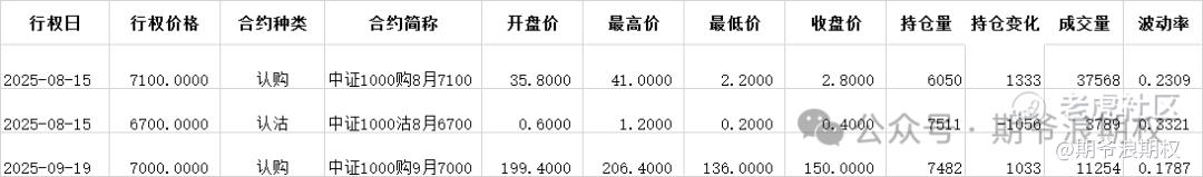 (4)中证1000期权:9月最大持仓范围6700-7000,今收6976.49,下跌1.24%,期权今天8月合约到期,进入9月主力合约。认购以增仓为主,主要集中在7000-7600,合计4200张;认沽也是以增仓为主,但量较少,主要集中在6500-7200,合计2500张。今天变化超过1000张的仓位如下,红色是增仓较多的仓位,绿色是减仓较多的仓位。