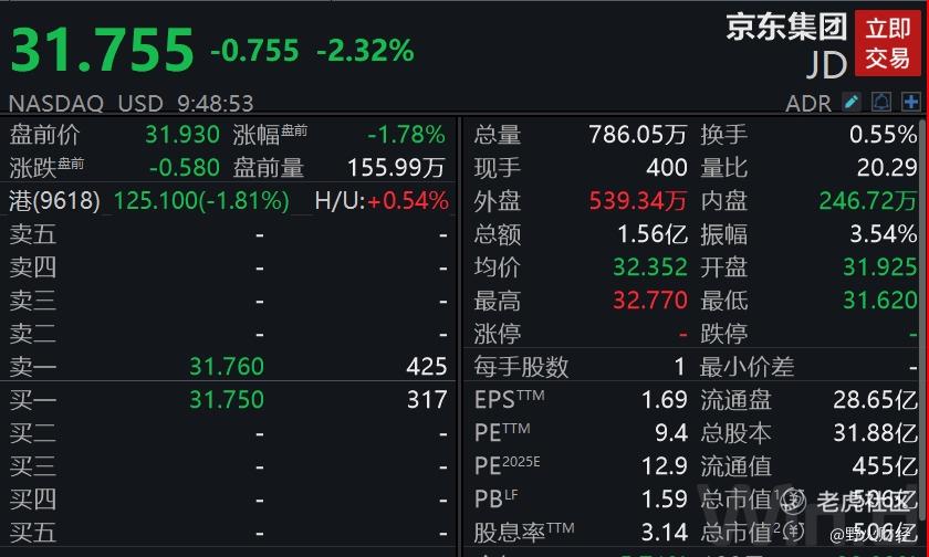 8月14日白天,京东在港股交易中跌1.8%。二季度及中期财报发布后,京东股价在美股交易中有明显下跌,至发稿时,最新市值大约500亿美元左右。