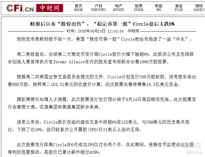 号称“稳定币第一股”的 $Circle Internet Corp.(CRCL)$ ,业绩好好的,却非要扩股增发,不跌都不行。投资者还没有的来得及消化财报带来的利好,就宣布大规模股票发行计划,市场对此反应非常负面。特别是现有股东出售800万股的规模,远超公司自身200万股的发行量,相当于为市场增加了可观的流通股供应,这可能加剧了投资者对内部人员套现的担忧。