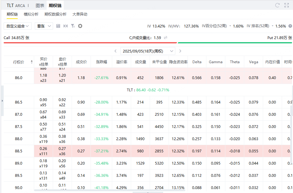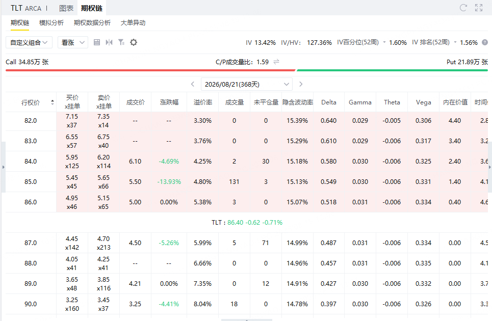 假设投资者在未来一年内都看好 $20+年以上美国国债ETF-iShares(TLT)$ ,可以直接买入行权价87,到期日为2026年8月21日的看涨期权。这个期权即成为我们的多头腿,以最新成交价计算需要花费450美元。