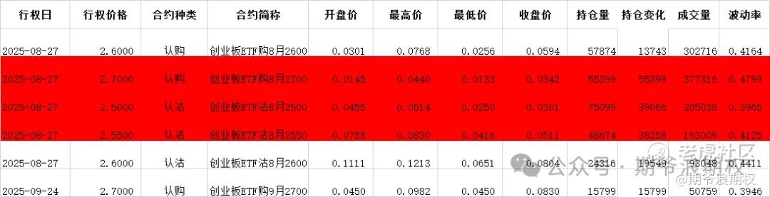 (3)创业板ETF期权:8月最大持仓范围2300-2500,今收2.582,上涨2.91%,期权8月主力合约,认购认沽都是低行权价减仓高行权价加仓。认购减仓主要集中在2350-2500,合计1.6W张,增仓集中在2550-2700,合计7.7W张;认沽减仓较小,增仓集中在2400-2700,合计11.8W张。今天变化超过1W张的仓位如下,红色是增仓较多的。