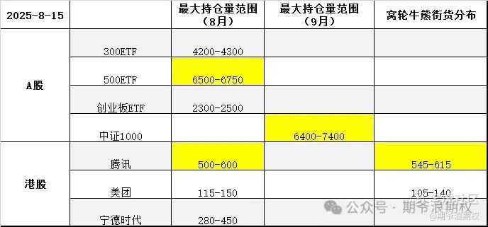 下图是今天大A的3个ETF和一个指数,以及港股的腾讯、美团和宁德时代的最大持仓量范围以及窝轮牛熊分布范围,也就是8月9月的资金筹码分布,黄色的表示跟上个交易日有变动。