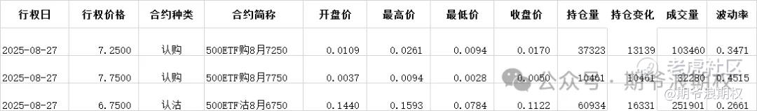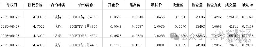 (1)沪深300ETF(沪)期权:8月最大持仓范围4200-4300,今收4.327,上涨0.75%,期权8月主力合约,认购是低行权价减仓高行权价加仓,减仓主要集中在4100-4300,合计2.4W张,增仓就是最高行权价2700,增加1.0W张;认沽也是低行权价减仓高行权价增仓,减仓主要集中在4000-4200,合计2.1W张,增仓主要集中在4300-4400,合计2.5W张。今天变化超过1W张的仓位如下