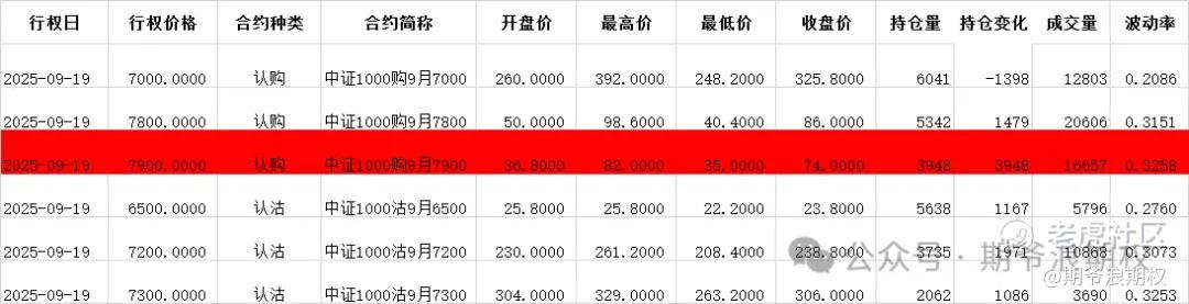 (4)中证1000期权:9月最大持仓范围6400-7400,今收7237.60,上涨1.69%,期权9月主力合约。认购认沽都是低行权价减仓高行权价加仓。认购减仓主要集中在7000-7100,合计2300W张,增仓集中在7200-7900,合计8800张;认沽减仓较小,增仓集中在6400-7500,合计8500张。今天变化超过1W张的仓位如下,红色是增仓较多的。