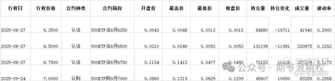 (2)中证500ETF(沪)期权:8月最大持仓范围6500-7000,今收6.824,上涨1.25%,期权8月主力合约,认购以减仓为主,主要集中在6500-6750,合计1.2W张;认沽是低行权价减仓高行权价增仓,减仓集中在6000-6500,合计3.7W张,增仓主要就是6750,增加1.6W张。今天变化超过1W张的仓位如下
