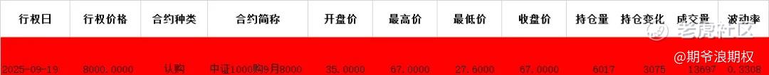 (4)中证1000期权:9月最大持仓范围6500-7400,今收7305.46,上涨0.86%,期权9月主力合约,认购是低行权价减仓高行权价加仓,减仓较少,增仓要集中在7200-8000,合计7300张,其中,今天刚刚增加的合约8000购就增加了3000张;认沽以增仓为主,集中在6100-7300,合计5800张。今天变化超过100张的仓位如下,红色是增仓较多的。