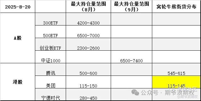 下图是今天大A的3个ETF和一个指数,以及港股的腾讯、美团和宁德时代的最大持仓量范围以及窝轮牛熊分布范围,也就是8月9月的资金筹码分布,黄色的表示跟上个交易日有变动。