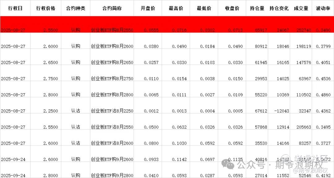 (3)创业板ETF期权:8月最大持仓范围2300-2600,今收2.588,上涨0.50%,期权8月主力合约,认购认沽都是低行权价减仓高行权价加仓。认购减仓较少,增仓集中在2550-2800,合计8.9W张;认沽集中在2150-2400,合计3.1W张,增仓集中在2550-2600,合计3.3W张。今天变化超过1W张的仓位如下,红色是增仓较多的。