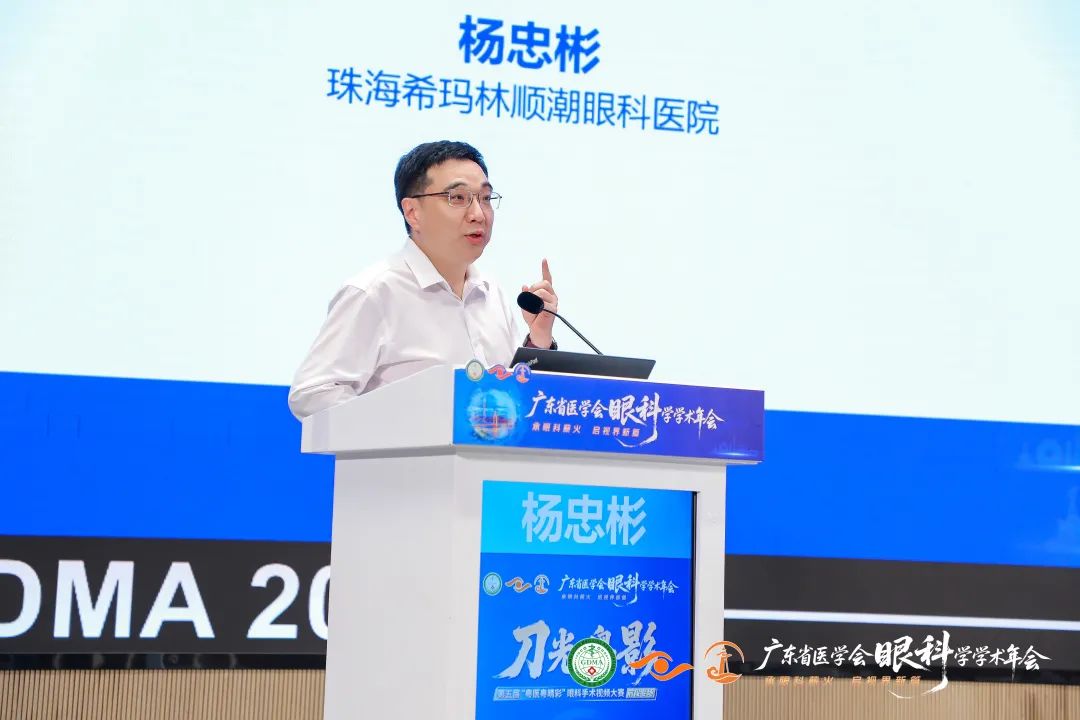 随后,在第五届“刀光粤影——粤医粤睛彩”眼科手术视频大赛前段专场中,杨忠彬院长以《双手IA在透明晶体置换矫正老花手术中的应用》为题,展示技术革新。