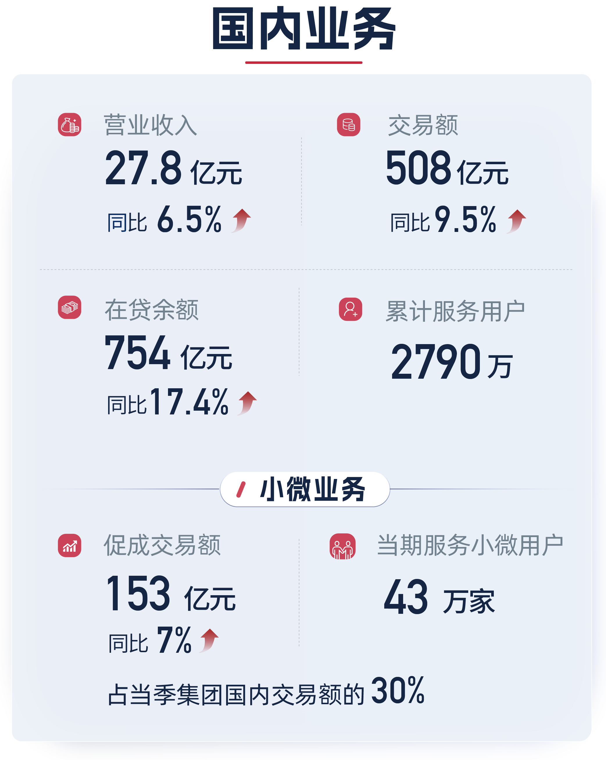 进入二季度,伴随多项刺激消费政策持续释放积极信号,消费市场热度不断攀升。在此背景下,信也科技国内业务取得稳健增长,当季国内促成交易额508亿元,同比增长9.5%;在贷余额754亿元,同比增长17.4%。小微业务方面,二季度信也科技服务43万家国内小微用户,促成交易额153亿元,同比增长7%,占当季集团国内交易额的30%。