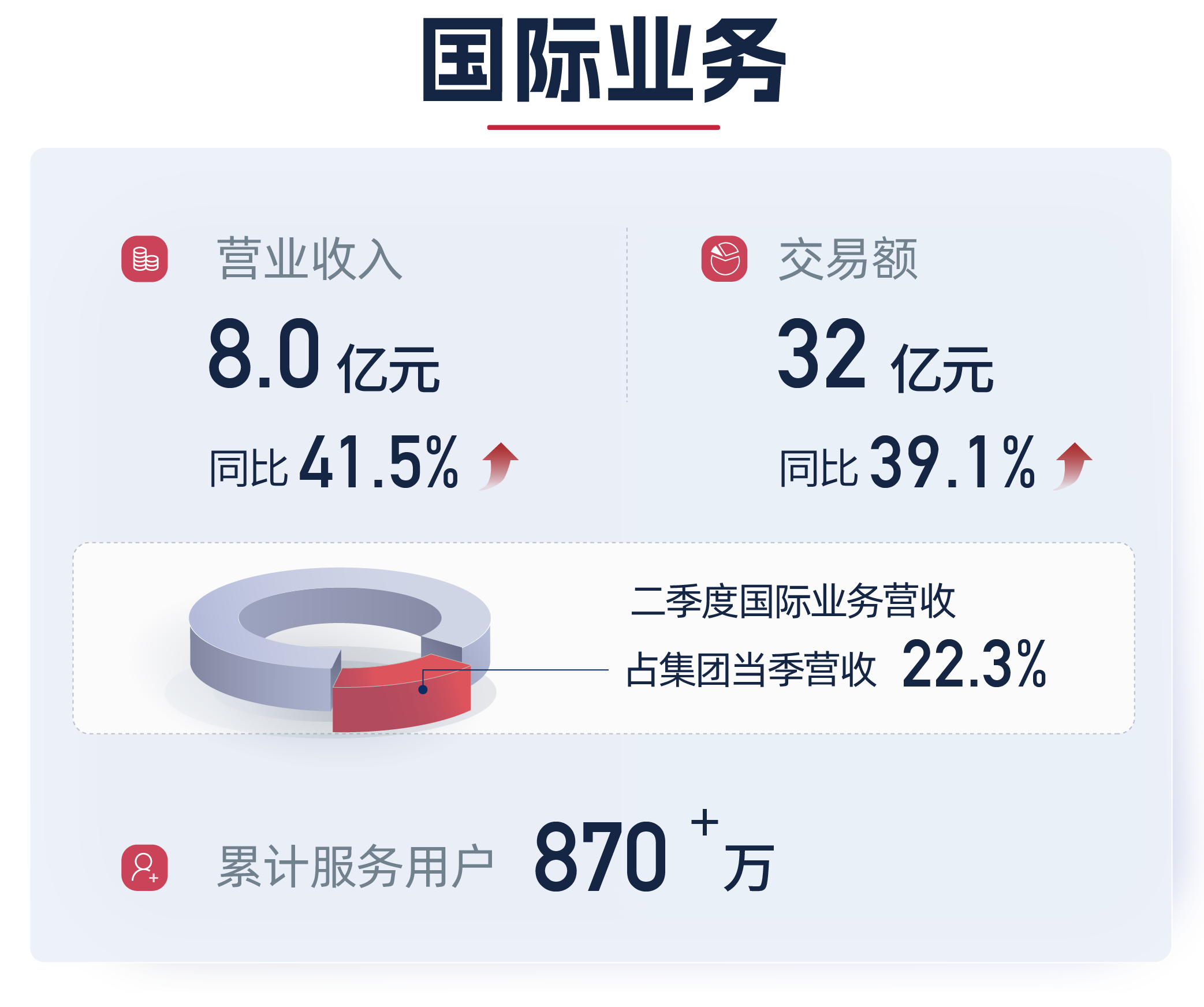 依托客群优化策略及与区域市场合作伙伴的深入协作,二季度国际业务交易额突破32亿元,同比增长39%;营收近8.0亿元,同比增长41.5%,占集团总营收的22.3%。截至二季度末,海外累计服务用户达870万人,业务布局持续多元化拓展。