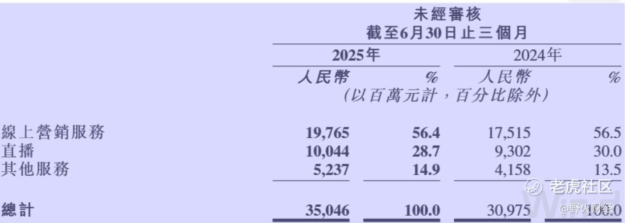 其营收主要来自线上营销、直播和电商等其他业务,分别获得收入198亿元、100亿元和52亿元,增长13%、8%、26%。