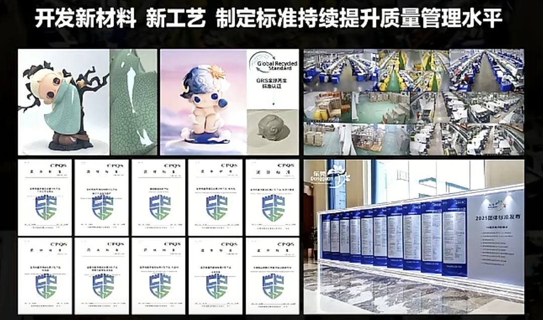 生产三要素的重构,生产力、生产资料和生产关系,我们觉得在新标准、新工艺、新技术的角度也同样就吻合了这样一种生产的再造,生产的重构。比如说举一个具体的例子,新材料、新工艺,我们现在有一种叫做多色共形注塑技术,以及叫做砂型3D打印技术。通过这种技术能够实现产品呈现出如大理石一般的脉络以及大理石一般的触感,配合着砂型3D打印技术,再配合着我们涂装油色的工艺,就会出现出类似中国瓷器,天青色等烟雨的汝窑这种冰裂纹的效果,这些都是我们所独家具有的,我相信这些也能对我们的艺术家,对我们的产品开发和设计提供更多的思维的源泉以及灵感。新标准,我们讲一流的企业制造标准创造标准,所以在今年上半年,我们联合广州海关,联合中国消费品促进保护会,同样发布了很多盲盒产品潮玩产品周边产品的产品标准,通过标准的导入,通过标准的制定引领行业的发展。在具体的操作环节,我们现在也在实现在线的巡检,AI质检等等这些工作,陆续在我们的三季度四季度都会一一呈现。