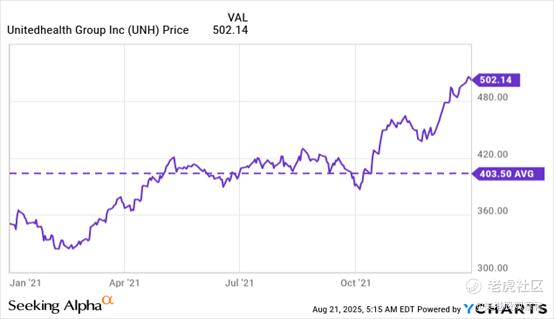 2021年联合健康的平均股价约为403美元/股,且随着该公司季度财报的持续发布,全年股价均呈上涨态势。