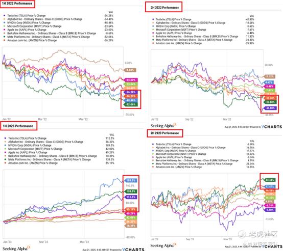 目前联合健康的反弹幅度并不大,但这种情况很快就会改变,而且这并非归因于巴菲特、伯里、特朗普或其他任何特定人物。这只是每当像联合健康这样规模的公司股价暴跌时,资产轮动所呈现的自然规律。以其巨头股票组合2022-2023年的表现为例:2022年一季度/二季度跌幅最大的股票,在次年往往会以最强劲的势头复苏,这正是市场情绪转变和资产重新配置的结果。