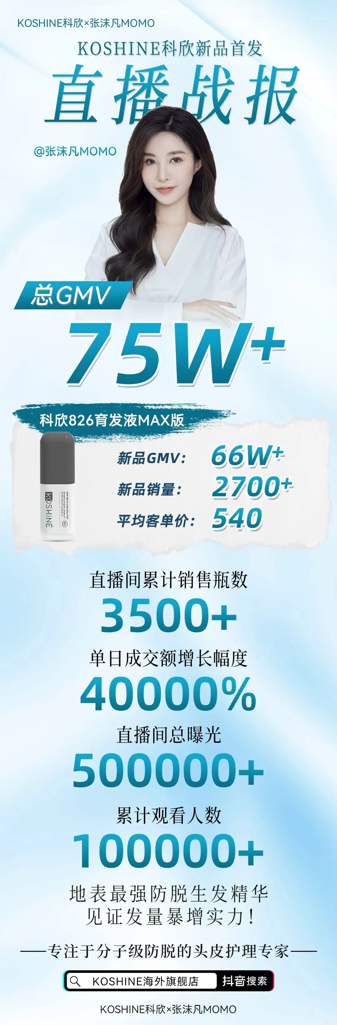 北京时间2025年8月26日,开拓药业(股票代码:9939.HK),宣布其KOSHINE科欣重磅新品—826防脱生发液MAX版,近日携手知名达人@张沫凡MOMO 完成直播首秀,创下总GMV超75万的亮眼成绩!直播间销售瓶数表现强劲,平均客单价高达500元以上,彰显产品强劲的市场号召力与消费者认可度。