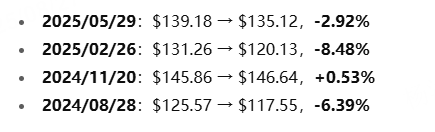 ——“高预期”带来的风险,过往的财报数据也有体现,近四次英伟达财报都是呈现“sell the fact, 股价回调”的状态,没有大涨的情况,财报前后两日收盘价变化:(所以这次盘后大涨的概率maybe也不大,想接货的还可以考虑sp一下。反正市场现在都在观望中[暗中观察])
