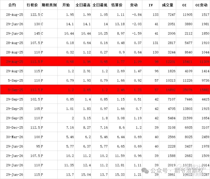(2)美团:9月最大持仓范围115-155,窝轮牛熊街货分布105-140,今收116.3,下跌3.08%,期权盘路变化超过1000张的仓位如下图,红色是增仓较大的仓位。其中8月112.5沽和9月112.5沽分别增仓1.1W张和1.5W张,美团期权一手对应正股5手,应该是有大资本手里握着5W手以上的美团,给自己的股票买保险,以防进一步的下跌。