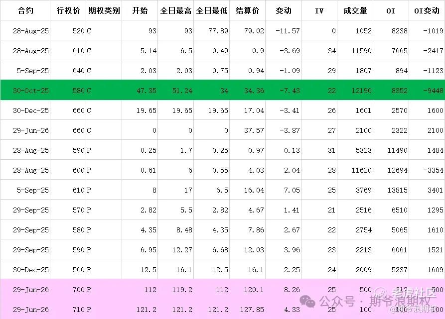(1)腾讯:9月最大持仓范围500-620,窝轮牛熊街货分布545-635,今收599.0,下跌1.72%,跌破600大关。期权盘路今变化超过1000张的仓位如下图,绿色是减仓较大的仓位,粉色是深度实值增仓。总的来说,市场对9月份的行情开始有些谨慎,但从长期来看,仍然对腾讯充满信心。