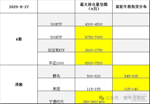 下图是今天大A的3个ETF和一个指数,以及港股的腾讯、美团和宁德时代的最大持仓量范围以及窝轮牛熊分布范围,也就是9月的资金筹码分布,黄色的表示跟上个交易日有变动。