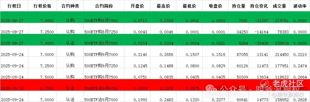 (2)中证500ETF(沪)期权:9月最大持仓范围6750-7000,今收6.953,下跌1.35%,期权9月主力合约,认购是低行权价减仓高行权价增仓,减仓较少,增仓集中在6750-8000,合计5.5W张;认沽是以增仓为主,集中在6750-7250,合计4.8W张。值得注意的是,支撑位上移一档。今天变化超过1W张的仓位如下,红色是增仓较大的仓位,绿色是减仓较大的仓位。