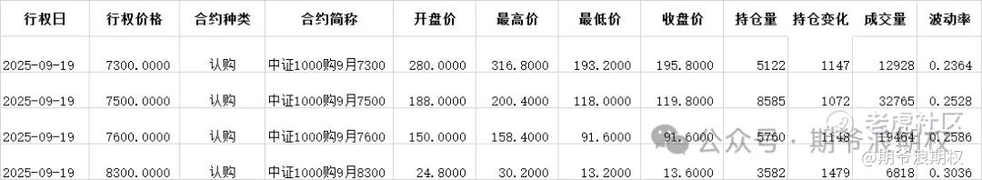 (4)中证1000期权:9月最大持仓范围6500-7500,今收7336.50,下跌1.87%,期权9月主力合约,认购有增有减,减仓较少,增仓要集中在7300-8300,合计6300张;认沽是7200及以下减仓,7300及以上增仓,增仓减仓量都不大。值得注意的是,压力位上移一档。今天变化超过1000张的仓位如下: