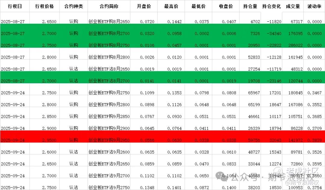 (3)创业板ETF期权:9月最大持仓范围2600-2750,今收2.696,下跌0.74% ,期权9月主力合约,认购是低行权价减仓高行权价增仓,减仓较少,增仓集中在2700-2950,合计10.5W张;认沽以增仓为主,集中在2400-2800,合计9.7W张。值得注意的是,支撑位上移了两档,压力位上移了三挡。今天变化超过1W张的仓位如下,红色是增仓较大的仓位,绿色是减仓较大的仓位。