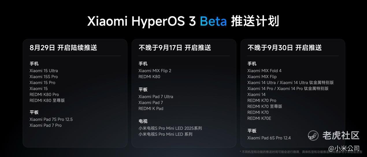 小米澎湃OS 3将于2025年8月29日为首批Beta机型开启陆续推送,覆盖Xiaomi 15系列、Xiaomi Pad 7S Pro 12.5、Xiaomi Pad 7 Pro、REDMI K80 Pro、REDMI K80 至尊版,并将陆续为更多机型开启推送。如需了解支持机型及具体计划,请持续关注小米官网及小米社区公告。