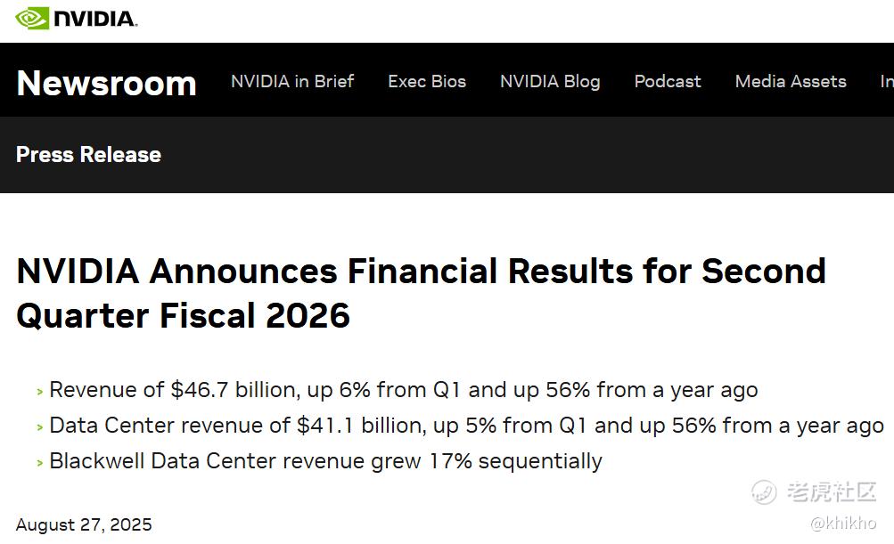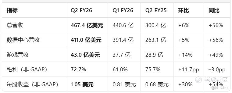 英伟达这次的财报表现非常优秀,营收、利润全面刷新纪录,数据中心依旧是绝对引擎,游戏业务也重回高增通道。除了下面这个表格里展示的各项关键指标,这次他们财报最大的亮点是 Blackwell平台推动数据中心收入环比增长17%;Gaming业务同比增长49%;公司宣布新增$60B股票回购授权。