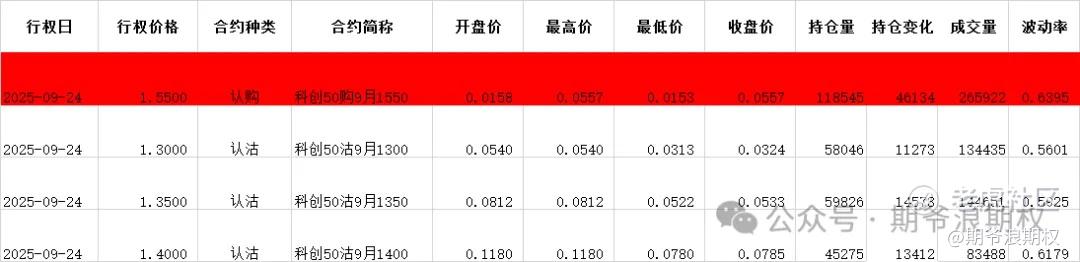 (2)科创50ETF:9月最大持仓范围1250-1400,今收1.433,上涨7.18%,期权9月主力合约,认购是低行权价减仓高行权价增仓,减仓较少,增仓集中在1450-1550,合计5.8W张;认沽以增仓为主,集中在1100-1400,合计6.1W张。今天变化超过1W张的仓位如下,红色是增仓较大的仓位。