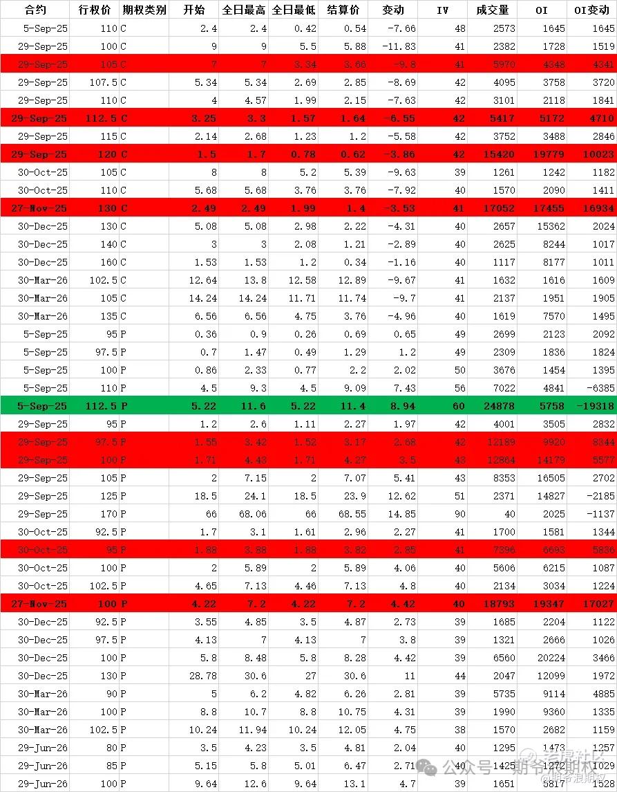 (2)美团:9月最大持仓范围115-120,窝轮牛熊街货分布105-125,今收101.7,下跌12.55%,期权盘路今天超级热闹,变化超过1000张的仓位如下图,红色是增仓较大的仓位。其中11月130购和11月100沽都增仓1.7W张,美团期权一手对应正股5手,应该是有大资本手里握着8.5W手以上的美团,给自己的股票买做了个领口策略,上面130止盈,下面100止损。