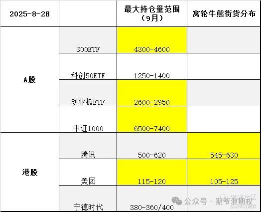 今天开始,富婆复盘标的中的500ETF换成科创50ETF。下图是今天大A的3个ETF和一个指数,以及港股的腾讯、美团和宁德时代的最大持仓量范围以及窝轮牛熊分布范围,也就是9月的资金筹码分布,黄色的表示跟上个交易日有变动。