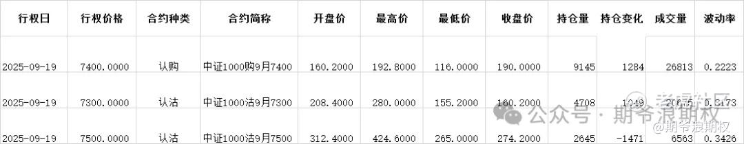 (4)中证1000期权:9月最大持仓范围6500-7400,今收7447.11,上涨1.51%,期权9月主力合约,认购有增有减,减仓较少,增仓要集中在7300-8000,合计4000张;认沽有增有减,增仓集中在7300-7400,合计1600张,减仓主要是7500减仓1400张。值得注意的是,压力位下移一档。今天变化超过1000张的仓位如下: