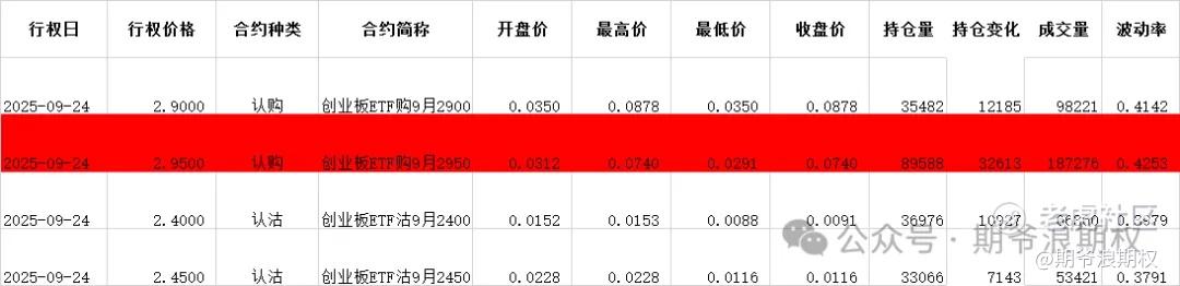 (3)创业板ETF期权:9月最大持仓范围2600-2950,今收2.806,上涨4.08%,期权9月主力合约,认购是以增仓为主,集中在2700-2950,合计7.2W张;认沽几乎全是增仓,集中在2350-2800,合计10.3W张。值得注意的是,压力位直接从2750跳到最高档2950。今天变化超过1W张的仓位如下,红色是增仓较大的仓位。